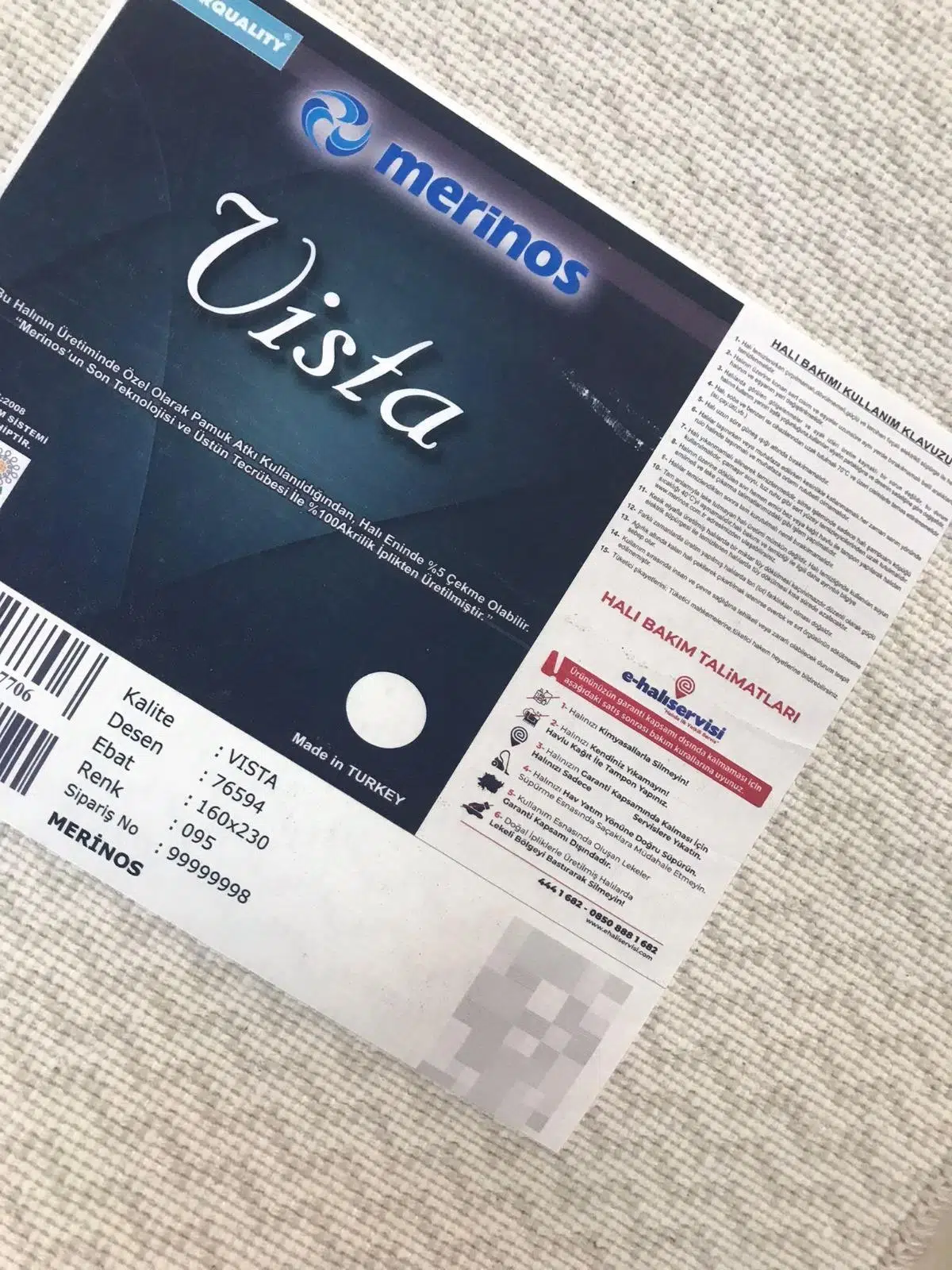 | Etiketler | Merinos Halı Vista 76594 095 Serisi Triko Akrilik Salon Oturma Yatak Odası Halısı |