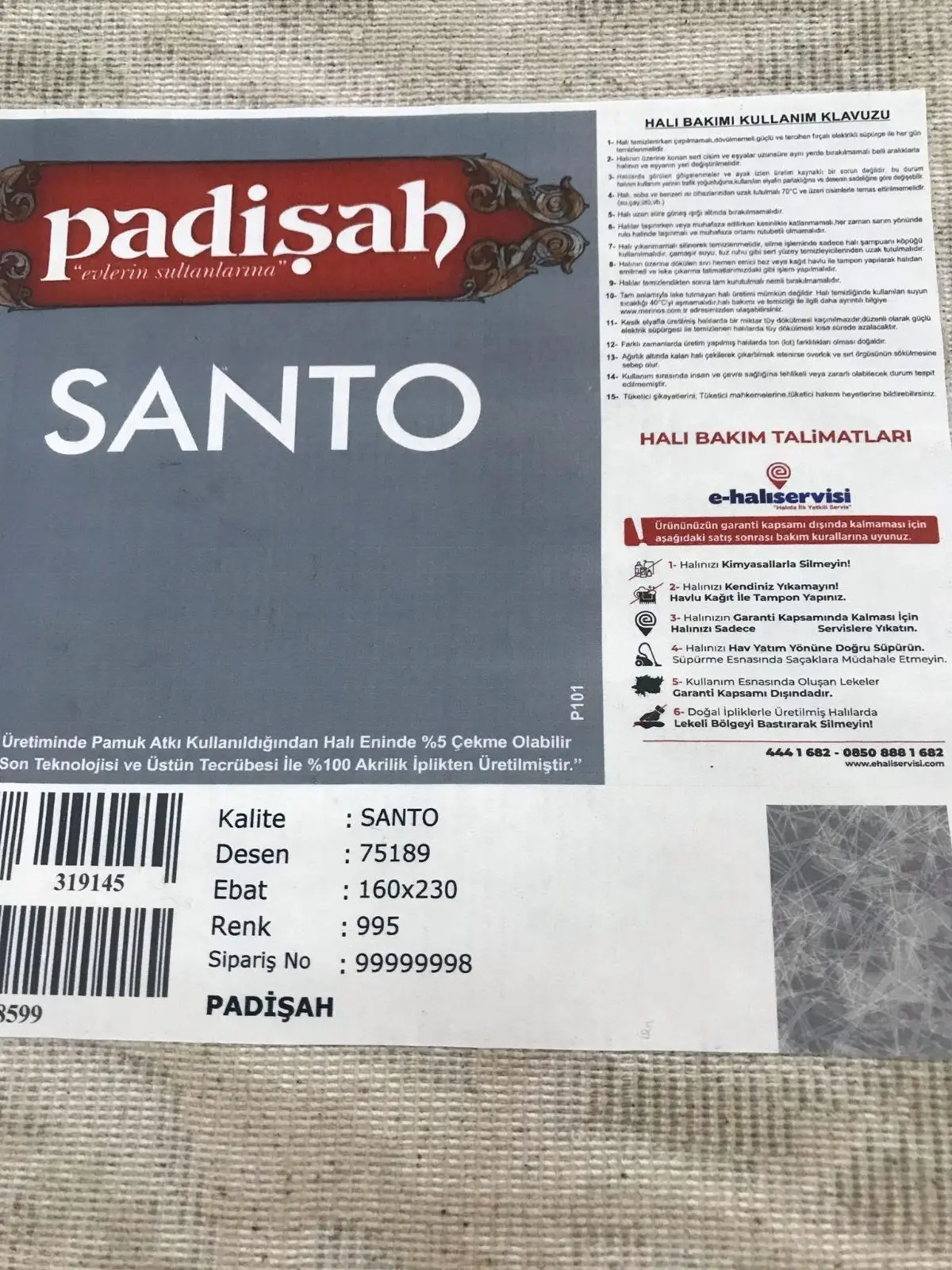 | Etiketler | Padişah Halı Santo 75189 995 Serisi Akrilik Salon Oturma Yatak Odası Halısı |